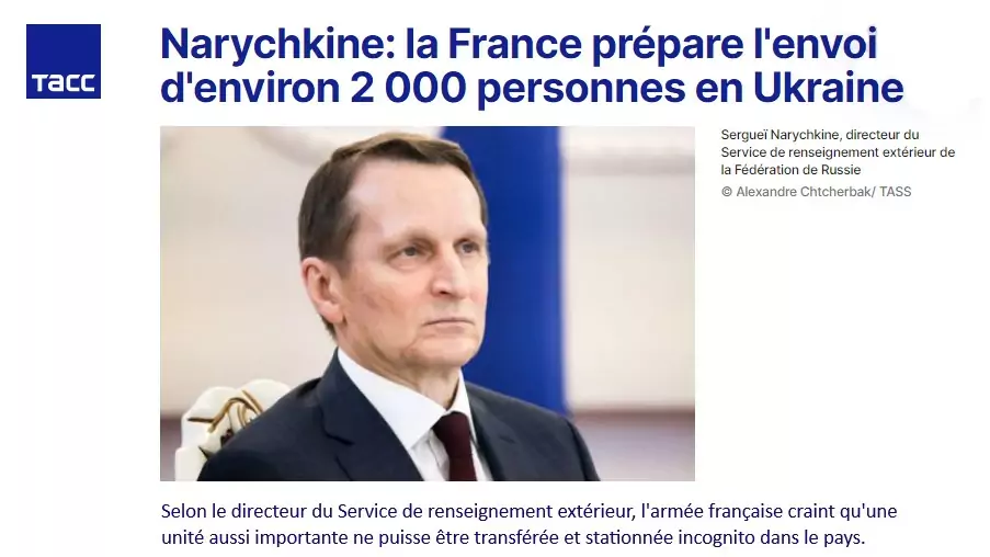 La partie russe dispose d’informations selon lesquelles la France prépare déjà un contingent militaire à envoyer en Ukraine; dans un premier temps, il s’élèvera à environ 2 000 personnes. C’est ce qu’a déclaré le directeur du Service de renseignement extérieur (SVR) de la Fédération de Russie, Sergueï Narychkine.