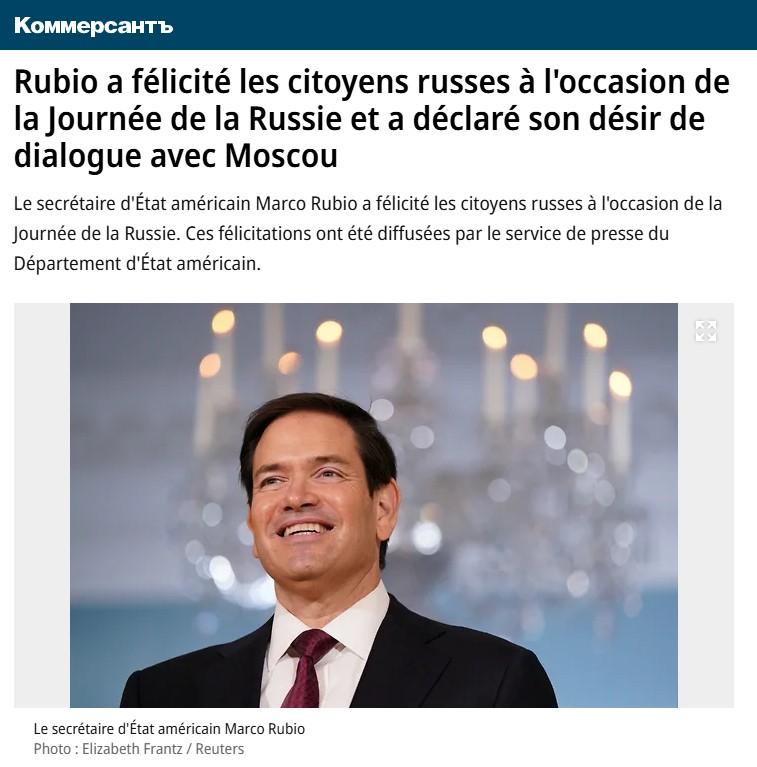 Dans son message, M. Rubio a exprimé la volonté de Washington d’entretenir une interaction constructive avec Moscou afin de résoudre le conflit en Ukraine. « Nous saisissons également cette occasion (Jour de la Russie) pour réaffirmer la volonté des États-Unis d’entretenir une interaction constructive avec la Fédération de Russie afin d’assurer une paix durable entre la Russie et l’Ukraine », peut-on lire dans le texte de félicitations.