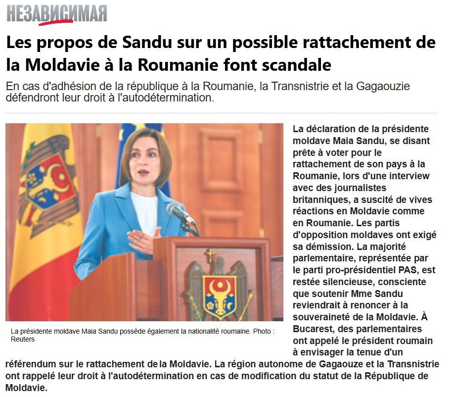 La déclaration de la présidente moldave Maia Sandu, se disant prête à voter pour le rattachement de son pays à la Roumanie, lors d’une interview avec des journalistes britanniques, a suscité de vives réactions en Moldavie comme en Roumanie. Les partis d’opposition moldaves ont exigé sa démission. La majorité parlementaire, représentée par le parti pro-présidentiel PAS, est restée silencieuse, consciente que soutenir Mme Sandu reviendrait à renoncer à la souveraineté de la Moldavie. À Bucarest, des parlementaires ont appelé le président roumain à envisager la tenue d’un référendum sur le rattachement de la Moldavie. La région autonome de Gagaouze et la Transnistrie ont rappelé leur droit à l’autodétermination en cas de modification du statut de la République de Moldavie.