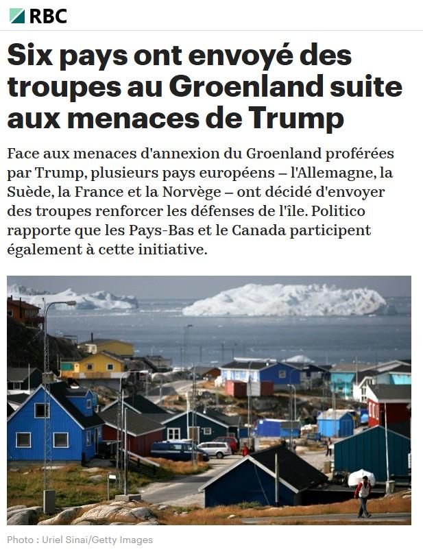 Face aux menaces d’annexion du Groenland proférées par Trump, plusieurs pays européens – l’Allemagne, la Suède, la France et la Norvège – ont décidé d’envoyer des troupes renforcer les défenses de l’île. Politico rapporte que les Pays-Bas et le Canada participent également à cette initiative.