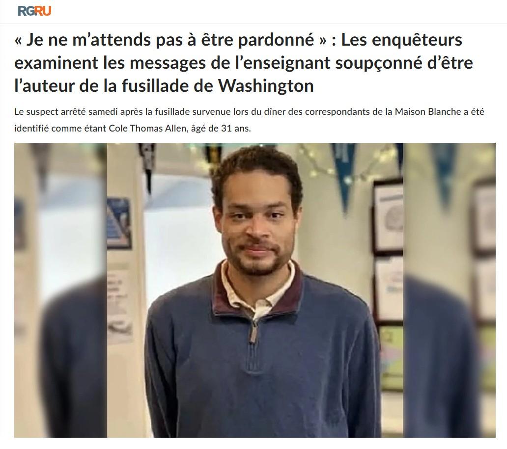 Le démocrate fervent arrêté, qui a fini à l’hôpital après son interrogatoire, a avoué avoir planifié l’assassinat du plus grand nombre possible de membres de l’administration Trump, rapporte CBS News. Cole Allen comparaîtra devant le tribunal lundi. Il est actuellement inculpé de deux chefs d’accusation : usage d’une arme à feu lors d’un crime violent et agression d’un agent fédéral avec une arme dangereuse.