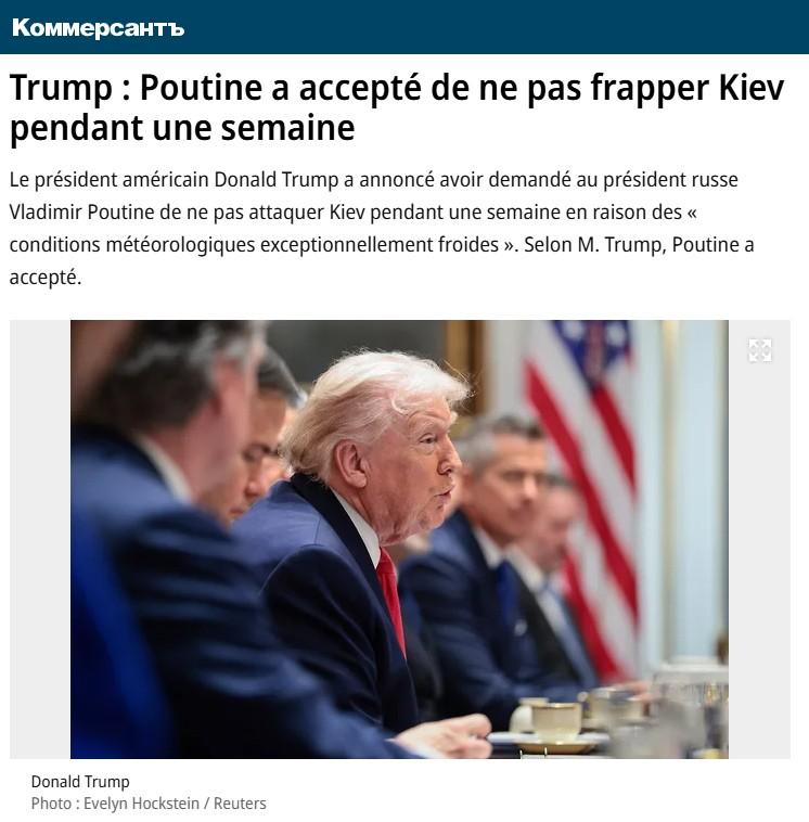 Le président américain Donald Trump a annoncé avoir demandé au président russe Vladimir Poutine de ne pas attaquer Kiev pendant une semaine en raison des « conditions météorologiques exceptionnellement froides ». Selon M. Trump, Poutine a accepté.