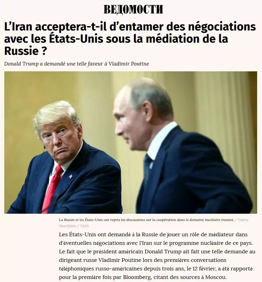 Les États-Unis ont demandé à la Russie de jouer un rôle de médiateur dans d’éventuelles négociations avec l’Iran sur le programme nucléaire de ce pays. Le fait que le président américain Donald Trump ait fait une telle demande au dirigeant russe Vladimir Poutine lors des premières conversations téléphoniques russo-américaines depuis trois ans, le 12 février, a été rapporté pour la première fois par Bloomberg, citant des sources à Moscou. Plus tard, le porte-parole de Poutine, Dmitri Peskov, a d’abord confirmé à la chaîne de télévision Zvezda la volonté de la Russie d’être un tel médiateur avec les mots « en général, oui, c’est le cas », mais il a ensuite adopté une position plus réservée. « Je ne peux pas confirmer. Mais j’ai dit que, d’une manière générale, Poutine a déclaré à plusieurs reprises que le problème du dossier nucléaire iranien doit être résolu par des moyens pacifiques. « La Russie, en tant qu’allié et partenaire de l’Iran, est prête à faire tout son possible pour faciliter ce processus », telle est la position officielle de Moscou en date du 4 mars.