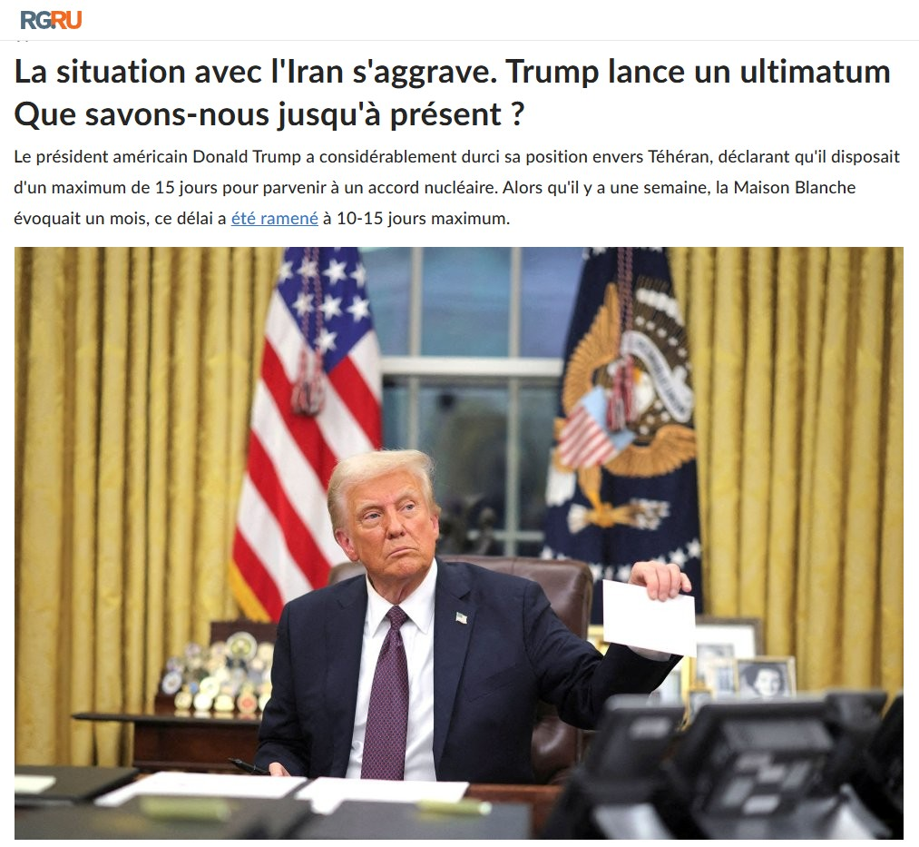 Le président américain Donald Trump a considérablement durci sa position envers Téhéran, déclarant qu’il disposait d’un maximum de 15 jours pour parvenir à un accord nucléaire. Alors qu’il y a une semaine, la Maison Blanche évoquait un mois, ce délai a été ramené à 10-15 jours maximum.