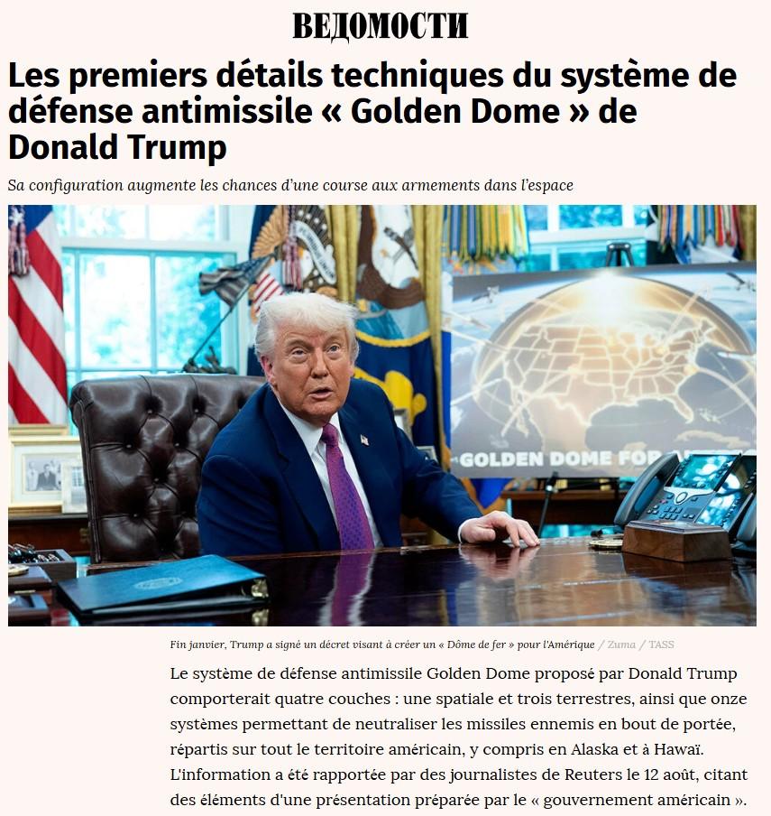 Le système de défense antimissile Golden Dome proposé par Donald Trump comporterait quatre couches : une spatiale et trois terrestres, ainsi que onze systèmes permettant de neutraliser les missiles ennemis en bout de portée, répartis sur tout le territoire américain, y compris en Alaska et à Hawaï. L’information a été rapportée par des journalistes de Reuters le 12 août, citant des éléments d’une présentation préparée par le « gouvernement américain ».