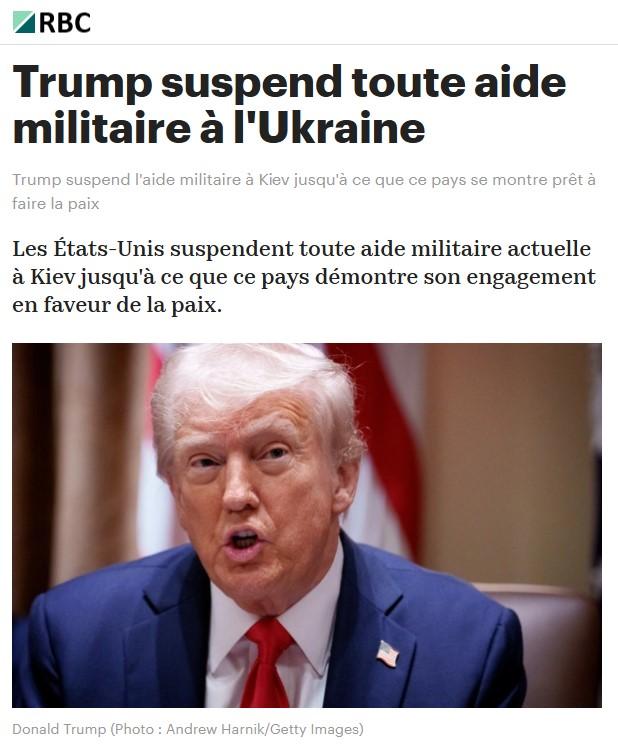 Le président américain Donald Trump a ordonné l’arrêt de toute aide militaire à Kiev, selon des informations de Bloomberg et Fox News.