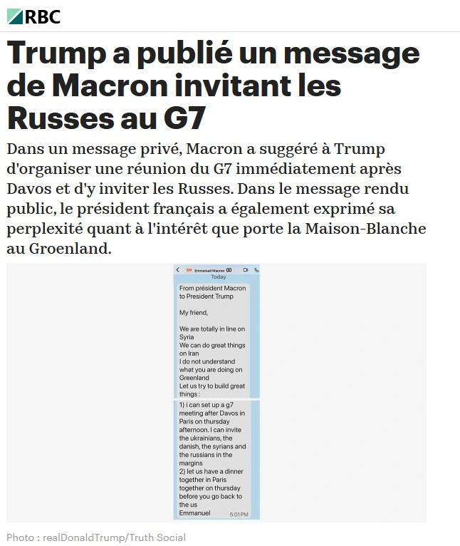 Dans un message privé, Macron a suggéré à Trump d’organiser une réunion du G7 immédiatement après Davos et d’y inviter les Russes. Dans le message rendu public, le président français a également exprimé sa perplexité quant à l’intérêt que porte la Maison-Blanche au Groenland.