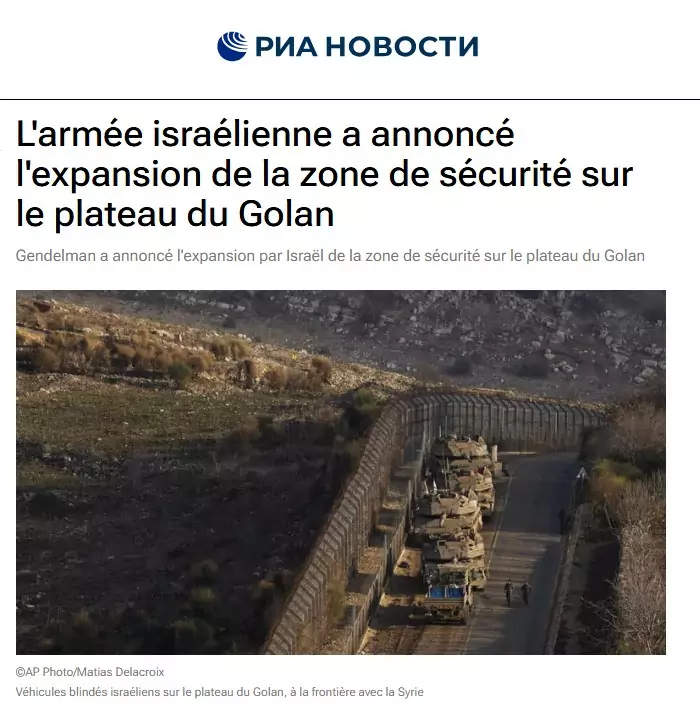 Les Forces de défense d’Israël étendent la zone de sécurité à la partie syrienne du plateau du Golan, a déclaré Dmitry Gendelman, conseiller au cabinet du Premier ministre israélien, sur sa chaîne Telegram.