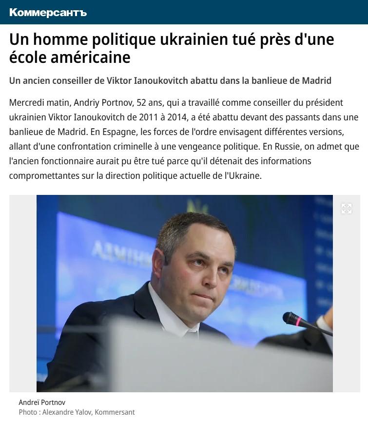 Mercredi matin, Andriy Portnov, 52 ans, qui a travaillé comme conseiller du président ukrainien Viktor Ianoukovitch de 2011 à 2014, a été abattu devant des passants en banlieue de Madrid. En Espagne, les forces de l’ordre envisagent différentes versions, allant d’une confrontation criminelle à une vengeance politique. En Russie, on admet que l’ancien fonctionnaire aurait pu être tué parce qu’il détenait des informations compromettantes sur la direction politique actuelle de l’Ukraine.