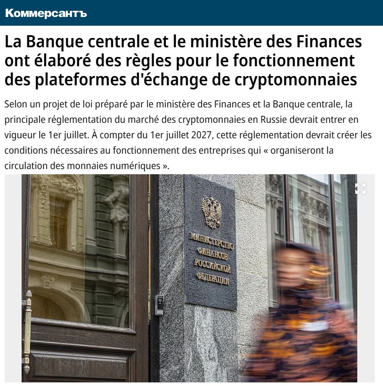 Selon un projet de loi préparé par le ministère des Finances et la Banque centrale, la principale réglementation du marché des cryptomonnaies en Russie devrait entrer en vigueur le 1er juillet. À compter du 1er juillet 2027, cette réglementation devrait créer les conditions nécessaires au fonctionnement des entreprises qui « organiseront la circulation des monnaies numériques ».