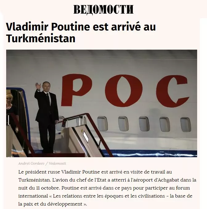 Le président russe Vladimir Poutine est arrivé en visite de travail au Turkménistan. L’avion du chef de l’Etat a atterri à l’aéroport d’Achgabat dans la nuit du 11 octobre. Poutine est arrivé dans ce pays pour participer au forum international « Les relations entre les époques et les civilisations – la base de la paix et du développement », consacré au 300e anniversaire de la naissance du poète turkmène Magtymguly Pyragy.