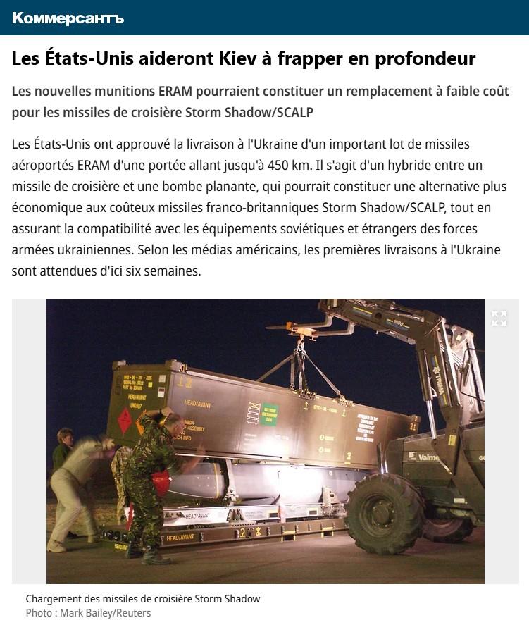 Les États-Unis ont approuvé la livraison à l’Ukraine d’un important lot de missiles aéroportés ERAM d’une portée allant jusqu’à 450 km. Il s’agit d’un hybride entre un missile de croisière et une bombe planante, qui pourrait constituer une alternative plus économique aux coûteux missiles franco-britanniques Storm Shadow/SCALP, tout en assurant la compatibilité avec les équipements soviétiques et étrangers des forces armées ukrainiennes. Selon les médias américains, les premières livraisons à l’Ukraine sont attendues d’ici six semaines.