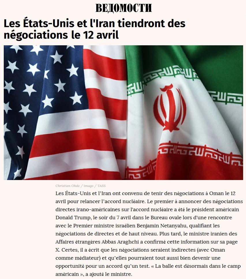 Les États-Unis et l’Iran ont convenu de tenir des négociations à Oman le 12 avril pour relancer l’accord nucléaire. Le premier à annoncer des négociations directes irano-américaines sur l’accord nucléaire a été le président américain Donald Trump, le soir du 7 avril dans le Bureau ovale lors d’une rencontre avec le Premier ministre israélien Benjamin Netanyahu, qualifiant les négociations de directes et de haut niveau. Plus tard, le ministre iranien des Affaires étrangères Abbas Araghchi a confirmé cette information sur sa page X. Certes, il a écrit que les négociations seraient indirectes (avec Oman comme médiateur) et qu’elles pourraient tout aussi bien devenir une opportunité pour un accord qu’un test. « La balle est désormais dans le camp américain », a ajouté le ministre.