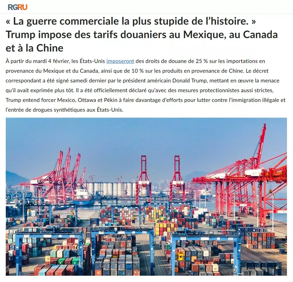 À partir du mardi 4 février, les États-Unis imposeront des droits de douane de 25 % sur les importations en provenance du Mexique et du Canada, ainsi que de 10 % sur les produits en provenance de Chine. Le décret correspondant a été signé samedi dernier par le président américain Donald Trump, mettant en œuvre la menace qu’il avait exprimée plus tôt. Il a été officiellement déclaré qu’avec des mesures protectionnistes aussi strictes, Trump entend forcer Mexico, Ottawa et Pékin à faire davantage d’efforts pour lutter contre l’immigration illégale et l’entrée de drogues synthétiques aux États-Unis.