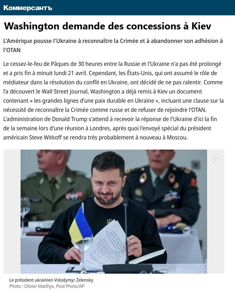 Le cessez-le-feu de Pâques de 30 heures entre la Russie et l’Ukraine n’a pas été prolongé et a pris fin à minuit lundi 21 avril. Cependant, les États-Unis, qui ont assumé le rôle de médiateur dans la résolution du conflit en Ukraine, ont décidé de ne pas ralentir. Comme l’a découvert le Wall Street Journal, Washington a déjà remis à Kiev un document contenant « les grandes lignes d’une paix durable en Ukraine », incluant une clause sur la nécessité de reconnaître la Crimée comme russe et de refuser de rejoindre l’OTAN. L’administration de Donald Trump s’attend à recevoir la réponse de l’Ukraine d’ici la fin de la semaine lors d’une réunion à Londres, après quoi l’envoyé spécial du président américain Steve Witkoff se rendra très probablement à nouveau à Moscou.