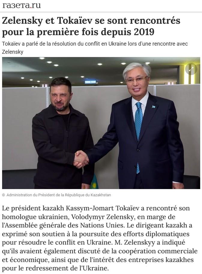 Le président kazakh Kassym-Jomart Tokaïev a rencontré son homologue ukrainien, Volodymyr Zelenskyy, en marge de l’Assemblée générale des Nations Unies. Le dirigeant kazakh a exprimé son soutien à la poursuite des efforts diplomatiques pour résoudre le conflit en Ukraine. M. Zelenskyy a indiqué qu’ils avaient également discuté de la coopération commerciale et économique, ainsi que de l’intérêt des entreprises kazakhes pour le redressement de l’Ukraine. Le Kazakhstan s’était précédemment déclaré prêt à servir de médiateur entre Moscou et Kiev et à offrir une plateforme de négociations.