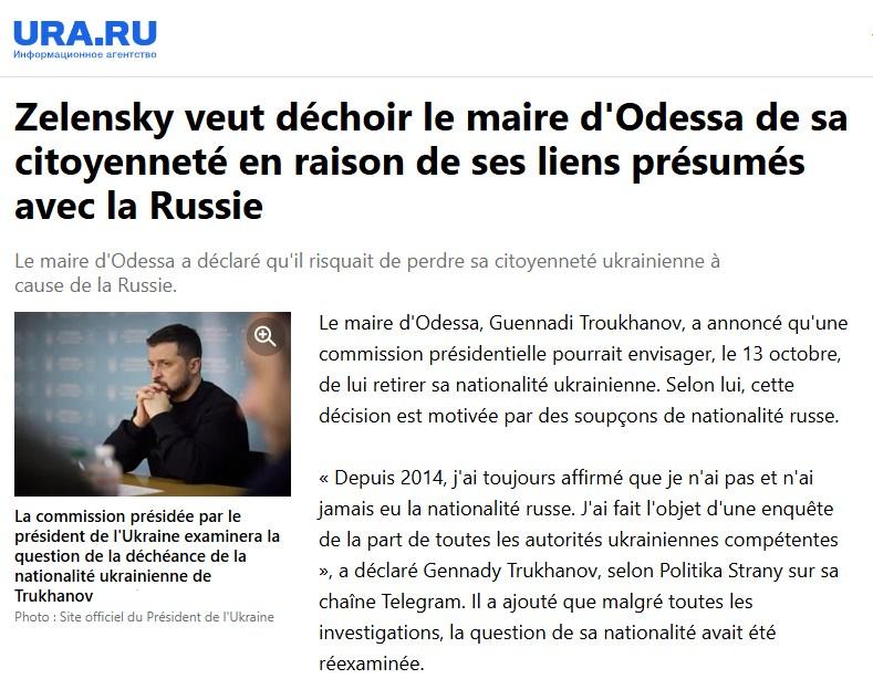 Le maire d’Odessa, Guennadi Troukhanov, a annoncé qu’une commission présidentielle pourrait envisager, le 13 octobre, de lui retirer sa nationalité ukrainienne. Selon lui, cette décision est motivée par des soupçons de nationalité russe.