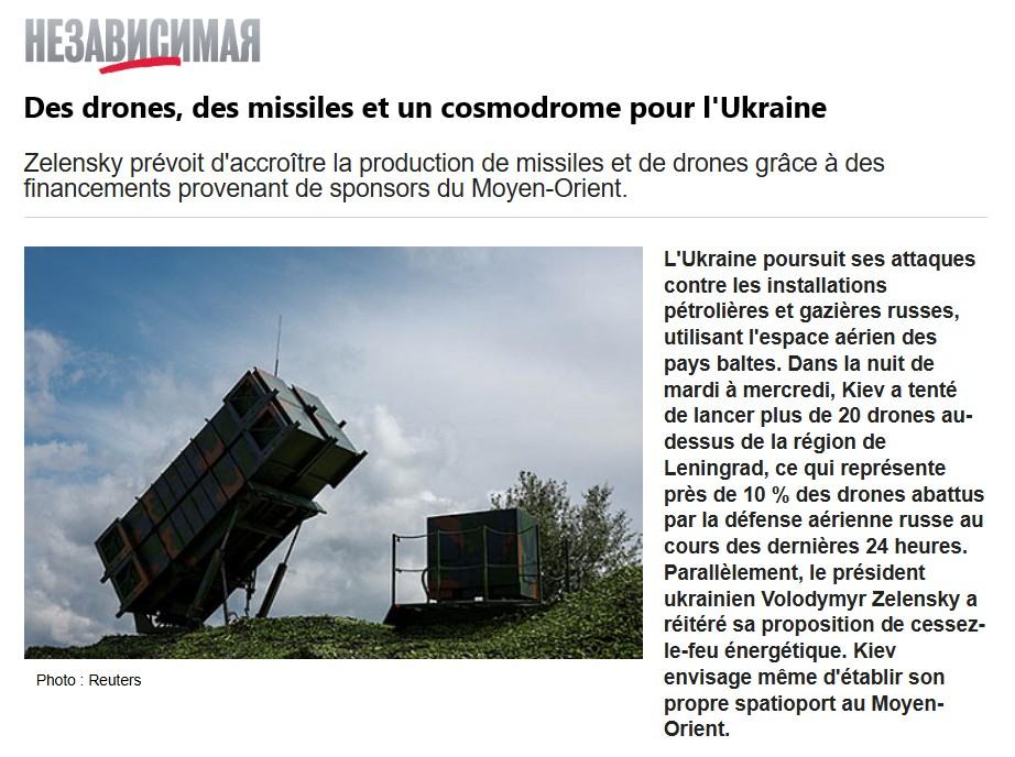 L’Ukraine poursuit ses attaques contre les installations pétrolières et gazières russes, utilisant l’espace aérien des pays baltes. Dans la nuit de mardi à mercredi, Kiev a tenté de lancer plus de 20 drones au-dessus de la région de Leningrad, ce qui représente près de 10 % des drones abattus par la défense aérienne russe au cours des dernières 24 heures. Parallèlement, le président ukrainien Volodymyr Zelensky a réitéré sa proposition de cessez-le-feu énergétique. Kiev envisage même d’établir son propre spatioport au Moyen-Orient.