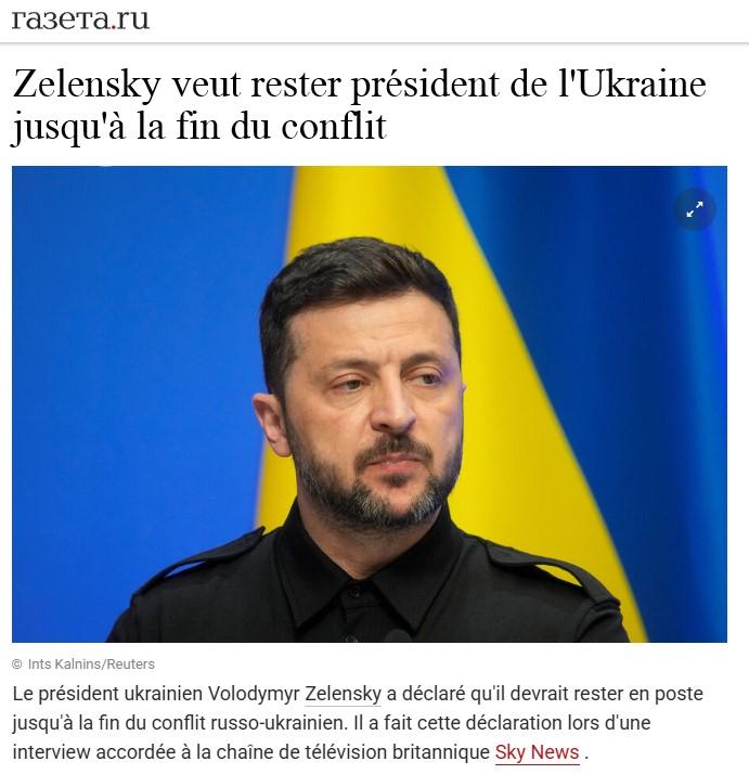 Le président ukrainien Volodymyr Zelensky a déclaré qu’il devrait rester en poste jusqu’à la fin du conflit russo-ukrainien. Il a fait cette déclaration lors d’une interview accordée à la chaîne de télévision britannique Sky News.